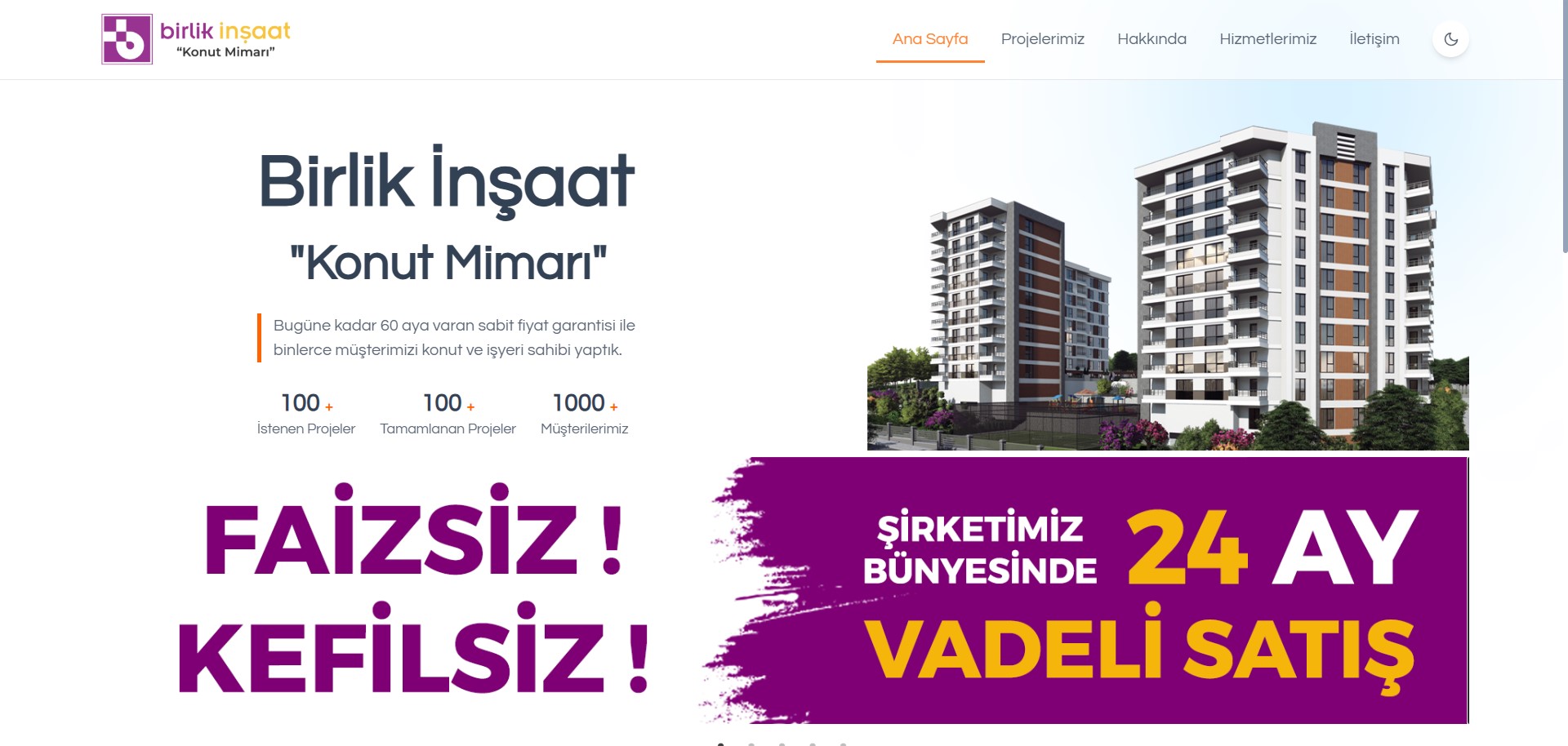Birlik İnşaat şirketi için hazırlanan aydınlık karanlık temalı web sitesi